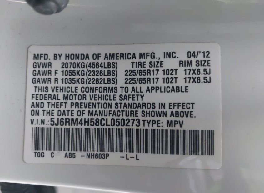 - VIN: 5J6RM4H58CL050273