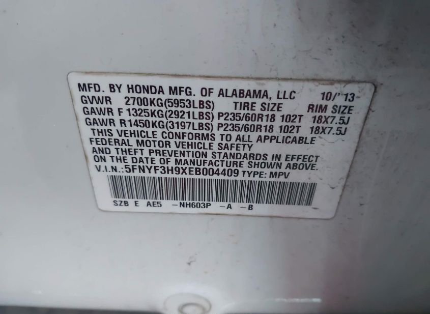 - VIN: 5FNYF3H9XEB004409