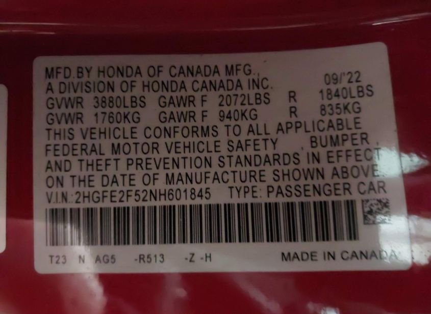 - VIN: 2HGFE2F52NH601845
