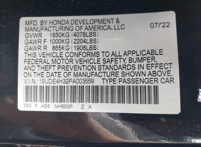 - VIN: 19UDE4H32PA003559
