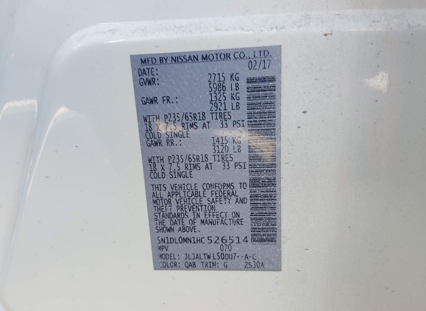 - VIN: 5N1DL0MN1HC526514