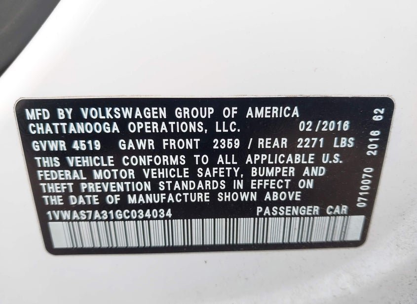 - VIN: 1VWAS7A31GC034034