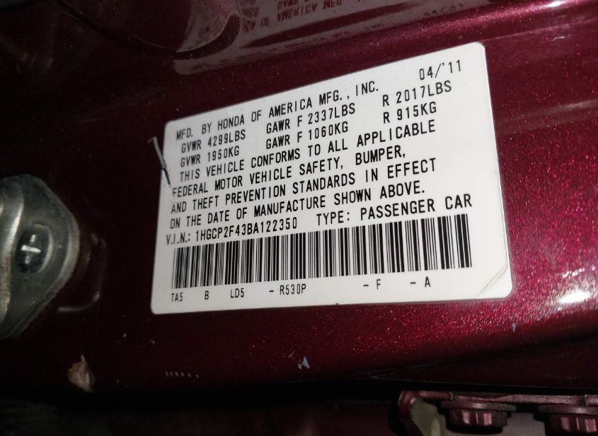 - VIN: 1HGCP2F43BA122350