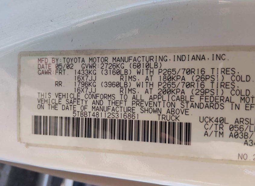 - VIN: 5TBBT48112S316861
