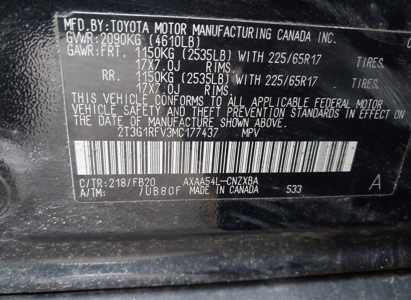- VIN: 2T3G1RFV3MC177437