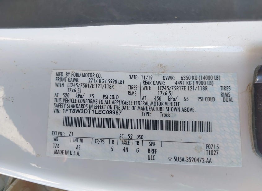 - VIN: 1FT8W3DT1LEC09987