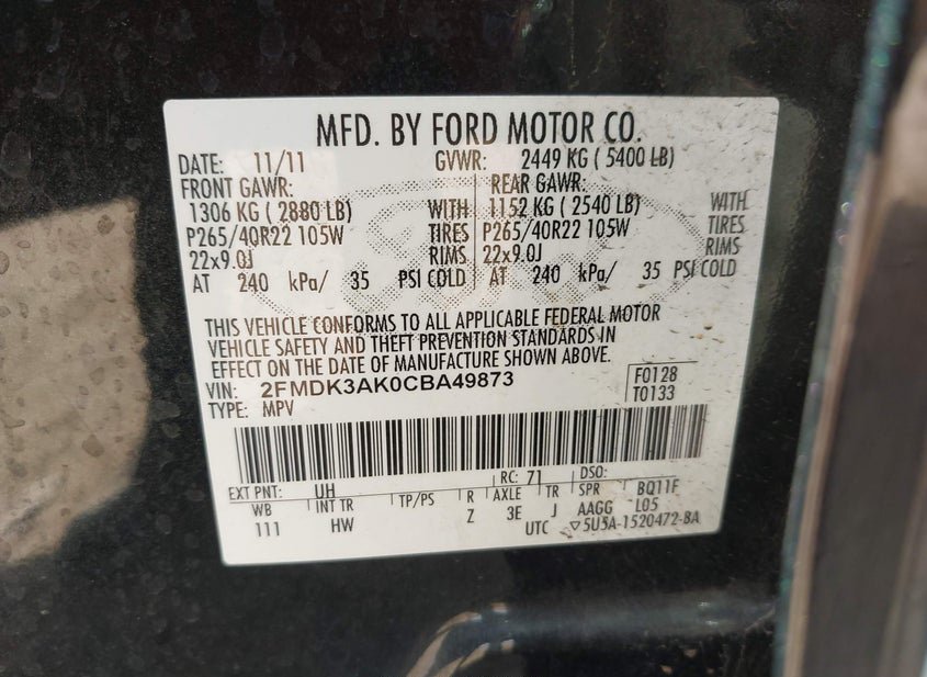 - VIN: 2FMDK3AK0CBA49873