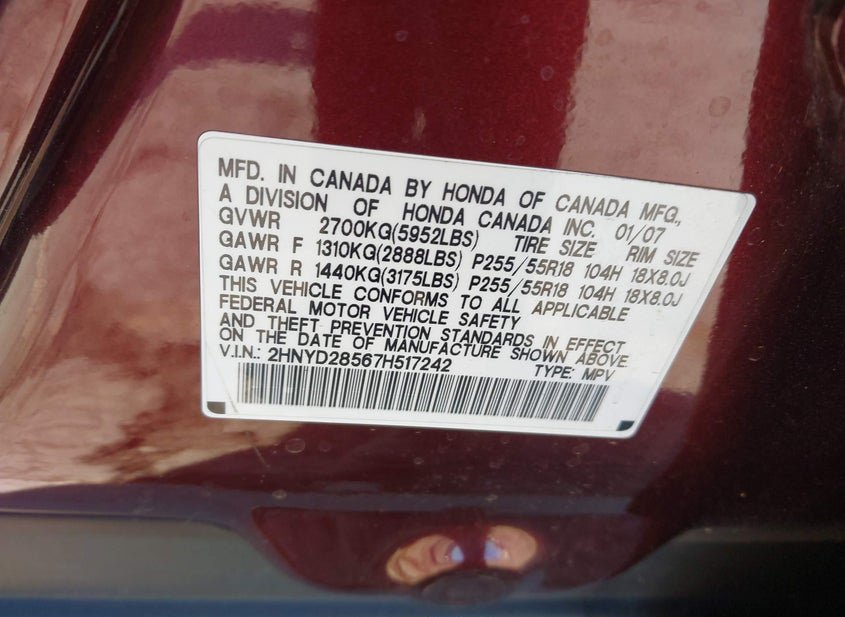 - VIN: 2HNYD28567H517242
