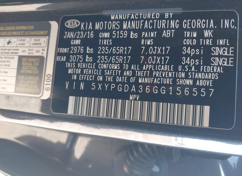 - VIN: 5XYPGDA36GG156557