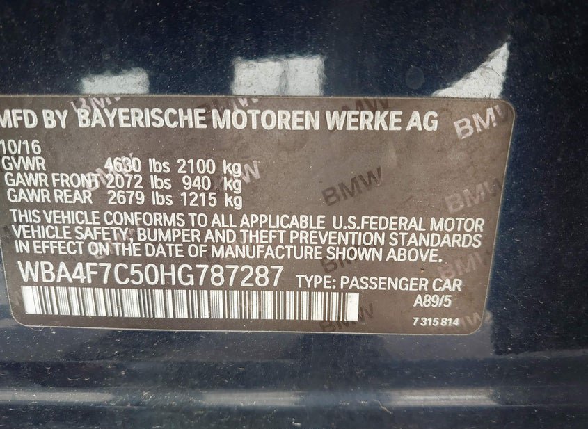 - VIN: WBA4F7C50HG787287