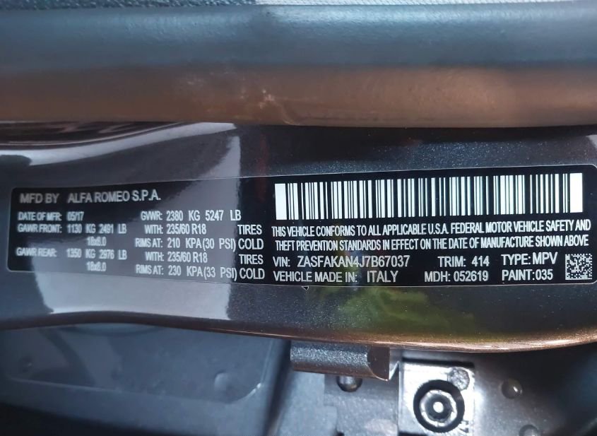 - VIN: ZASFAKAN4J7B67037