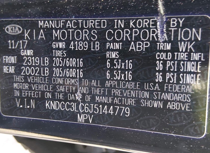 - VIN: KNDCC3LC6J5144779