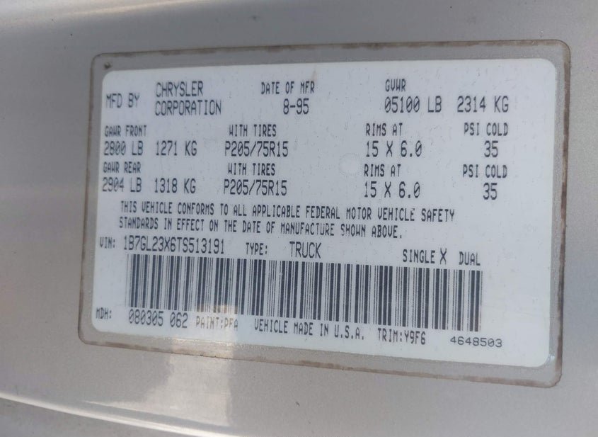 - VIN: 1B7GL23X6TS513191
