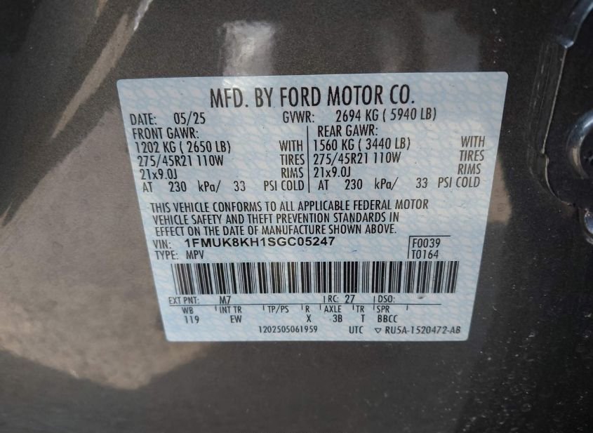 - VIN: 1FMUK8KH1SGC05247