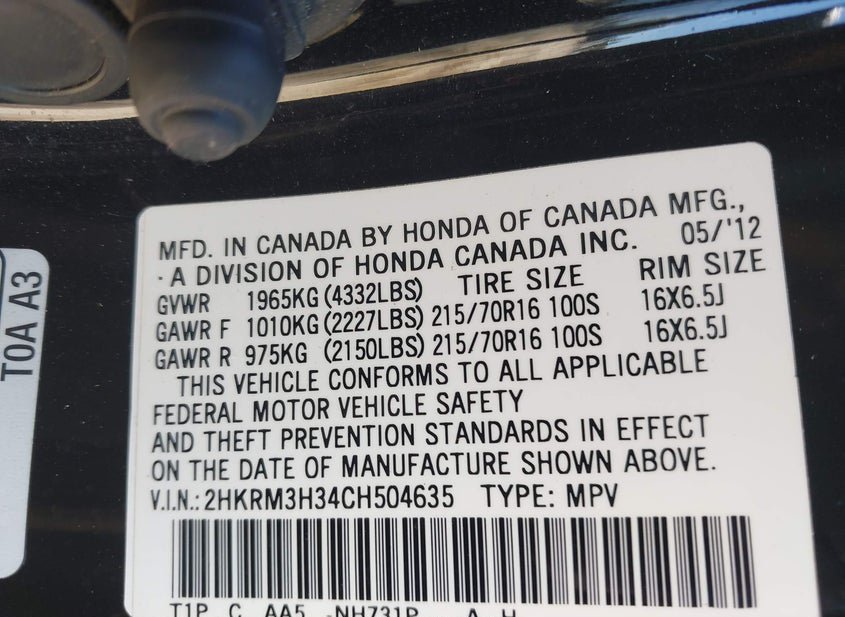 - VIN: 2HKRM3H34CH504635
