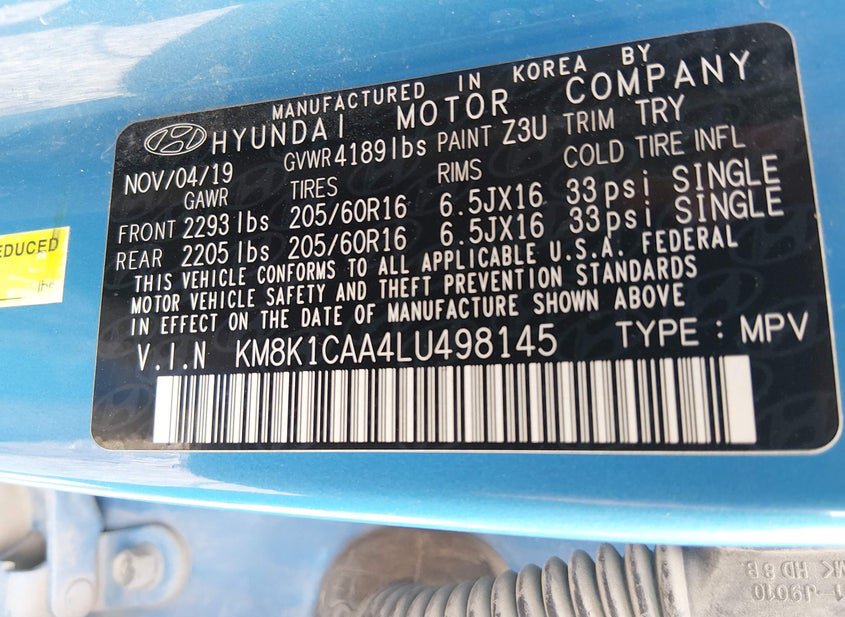 - VIN: KM8K1CAA4LU498145