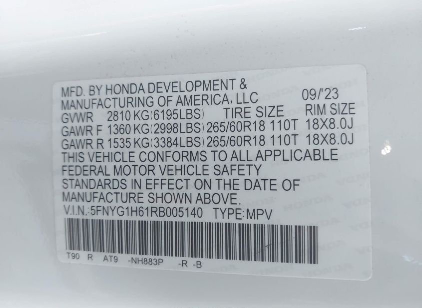 - VIN: 5FNYG1H61RB005140