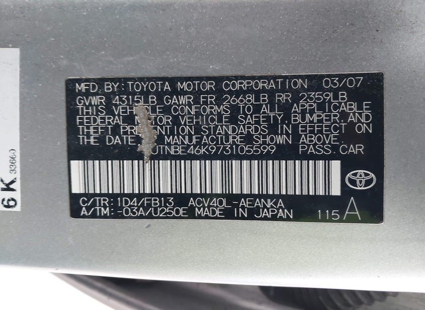 - Название лота: 2007 TOYOTA CAMRY CE