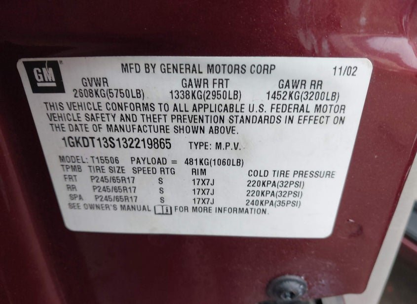 - VIN: 1GKDT13S132219865