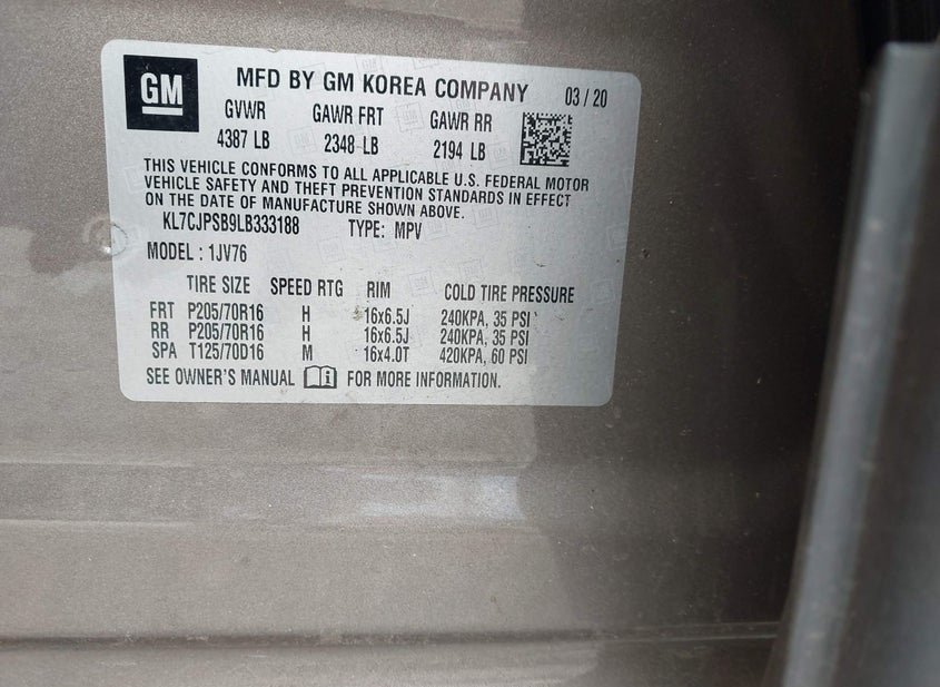 - VIN: KL7CJPSB9LB333188