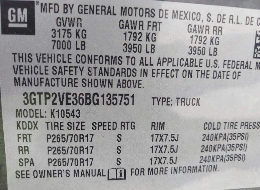 - VIN: 3GTP2VE36BG135751