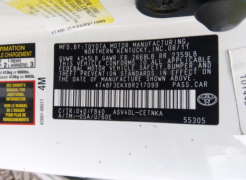 - VIN: 4T4BF3EKXBR217099