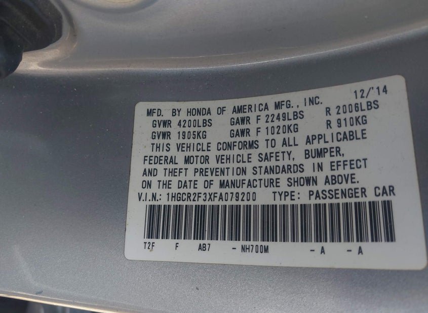 - VIN: 1HGCR2F3XFA079200
