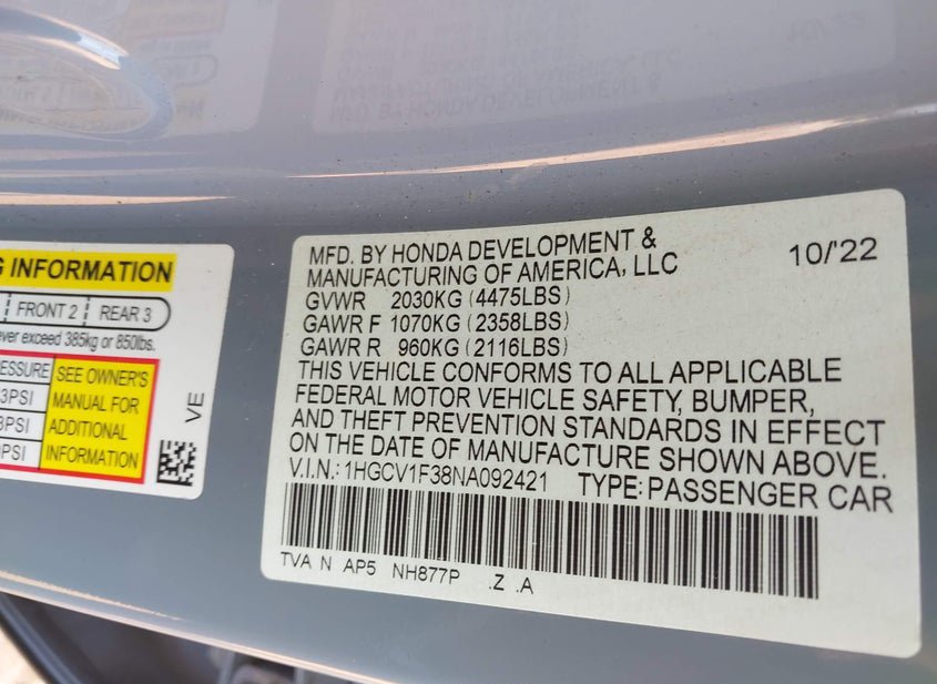 - VIN: 1HGCV1F38NA092421