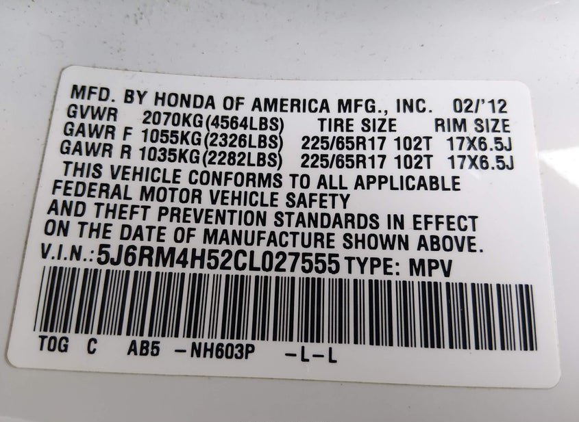 - VIN: 5J6RM4H52CL027555