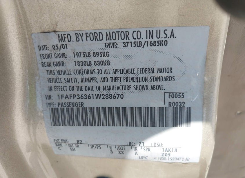 - VIN: 1FAFP36361W288670