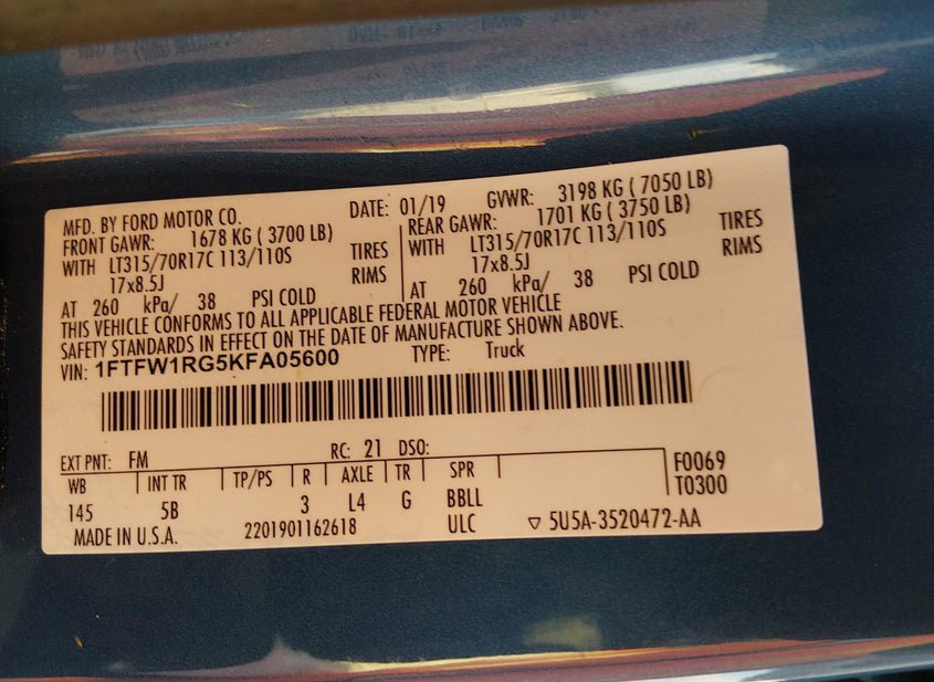 - VIN: 1FTFW1RG5KFA05600