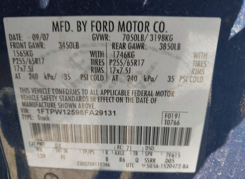 - VIN: 1FTPW12598FA29131