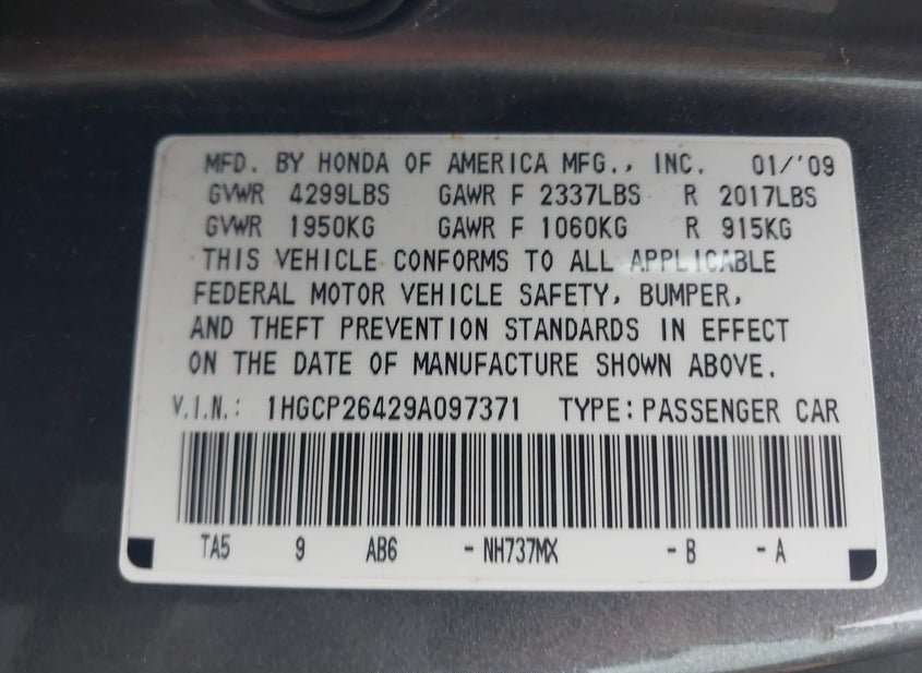 - VIN: 1HGCP26429A097371