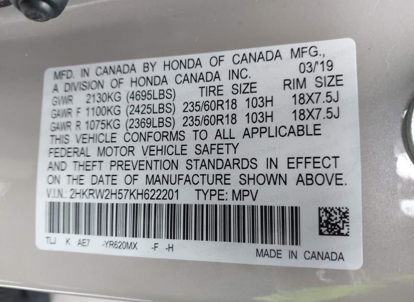 - VIN: 2HKRW2H57KH622201
