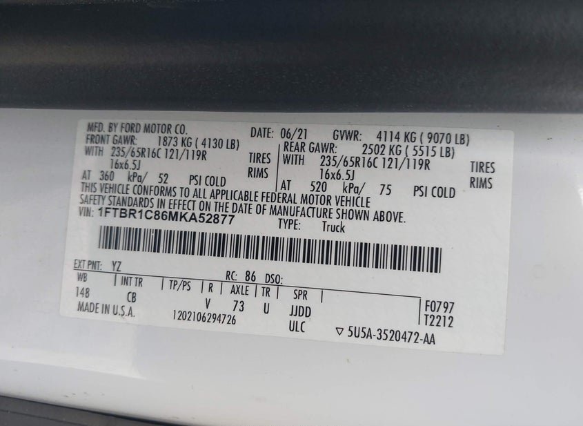 - VIN: 1FTBR1C86MKA52877