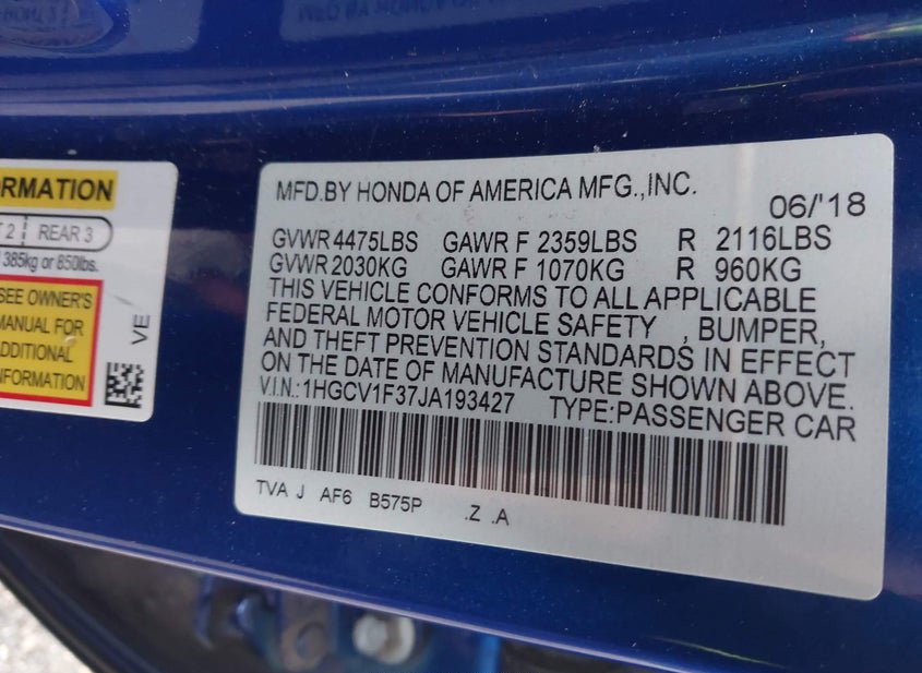 - VIN: 1HGCV1F37JA193427