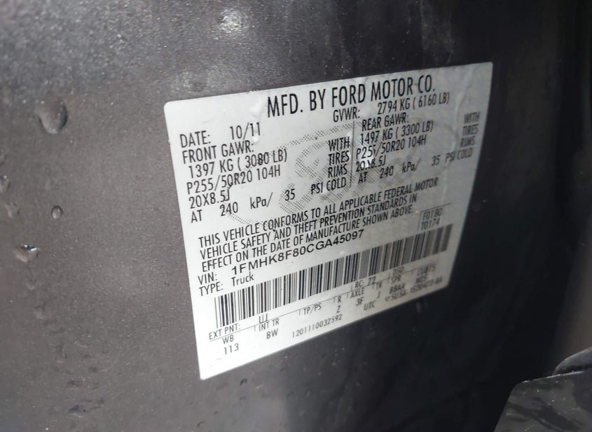 - VIN: 1FMHK8F80CGA45097