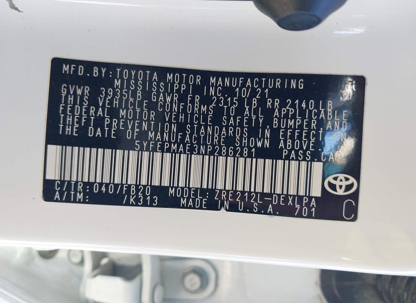 - VIN: 5YFEPMAE3NP286281