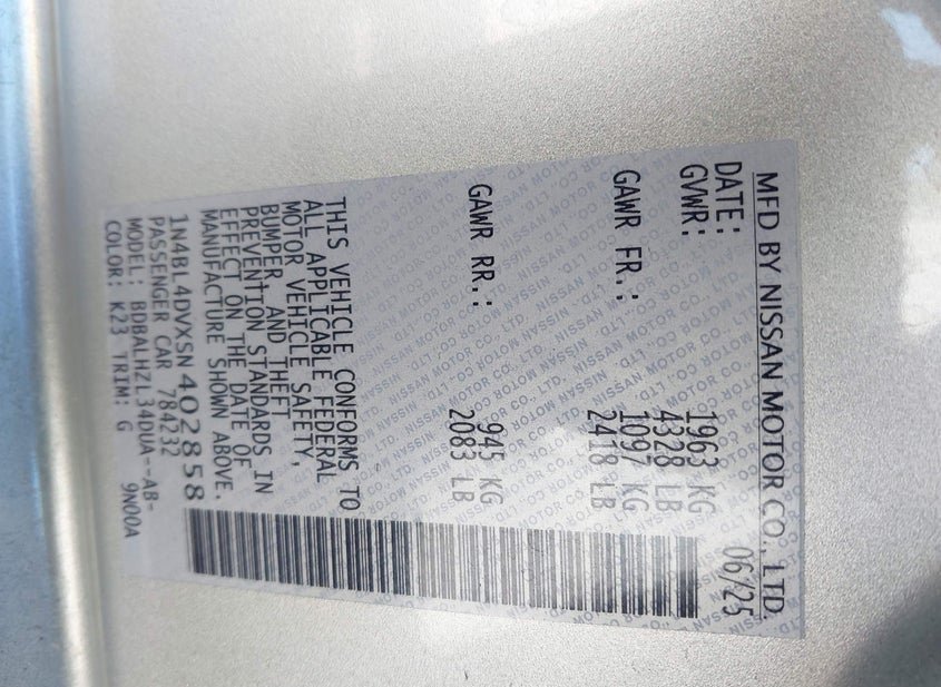 - VIN: 1N4BL4DVXSN402858