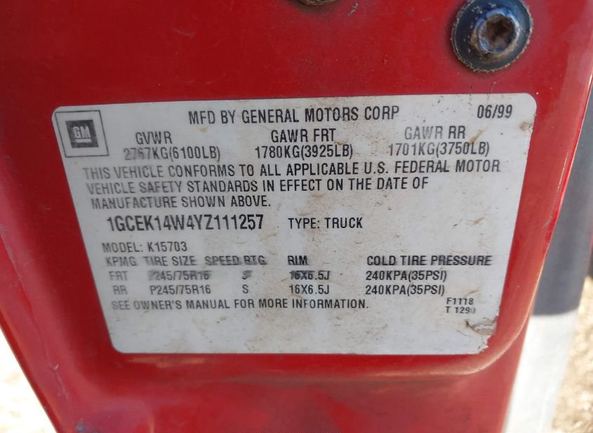 - VIN: 1GCEK14W4YZ111257