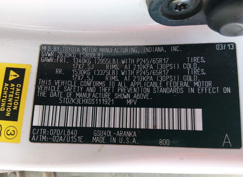 - VIN: 5TDZK3EHXDS111921