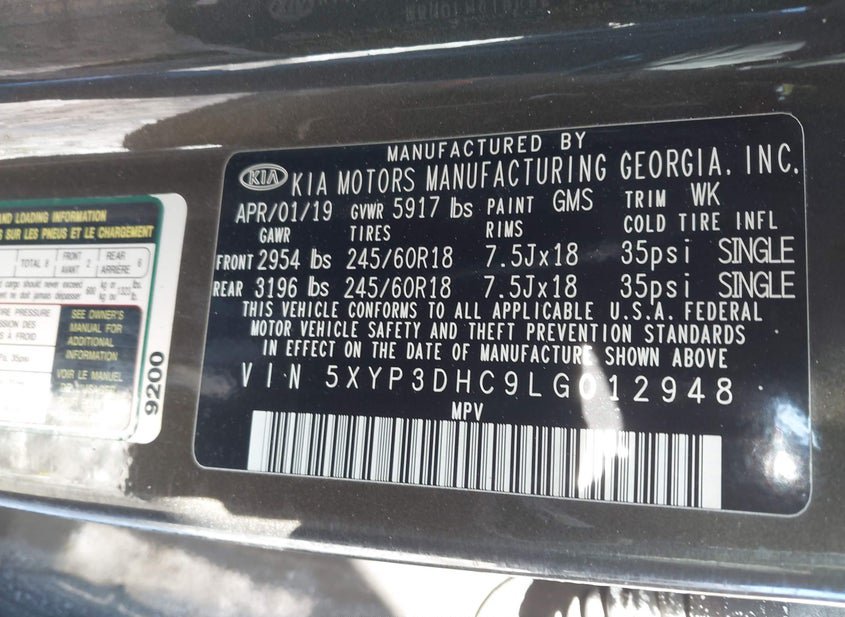 - VIN: 5XYP3DHC9LG012948