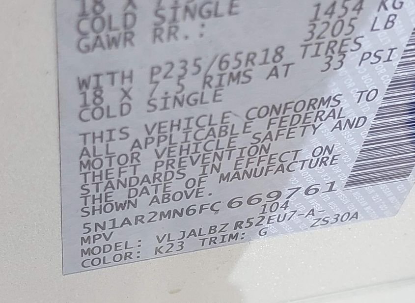 - VIN: 5N1AR2MN6FC669761