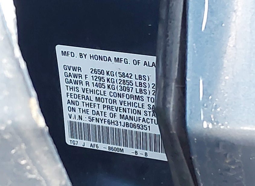 - VIN: 5FNYF6H31JB069351