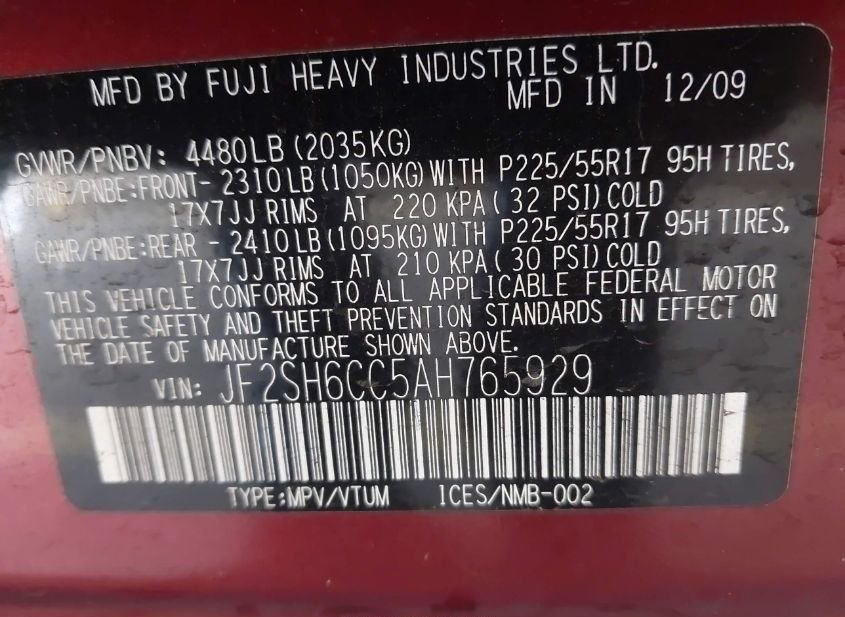 - VIN: JF2SH6CC5AH765929