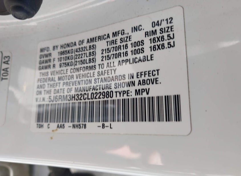 - VIN: 5J6RM3H32CL022980