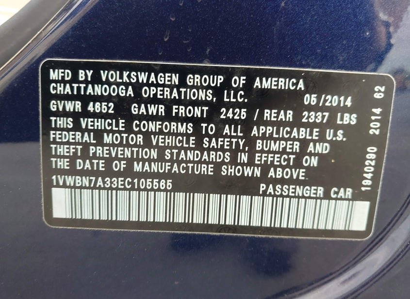 - VIN: 1VWBN7A33EC105565