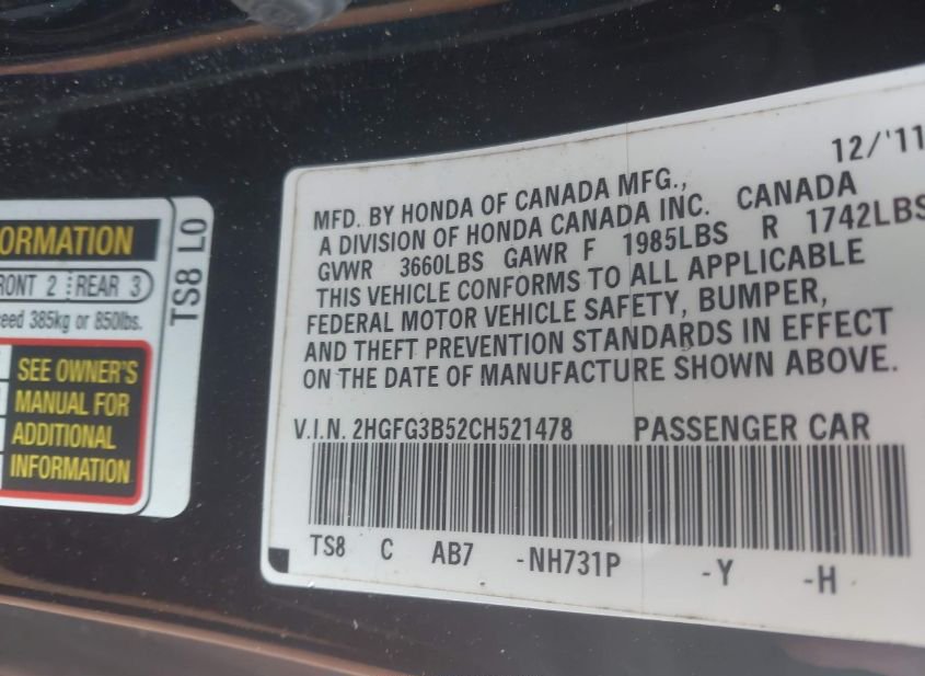 - VIN: 2HGFG3B52CH521478
