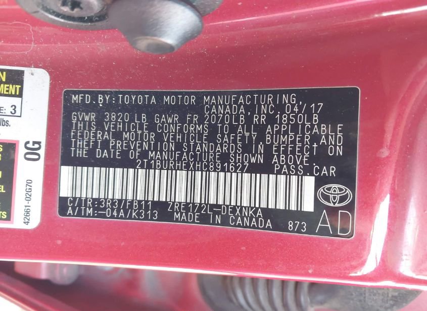 - VIN: 2T1BURHEXHC891627