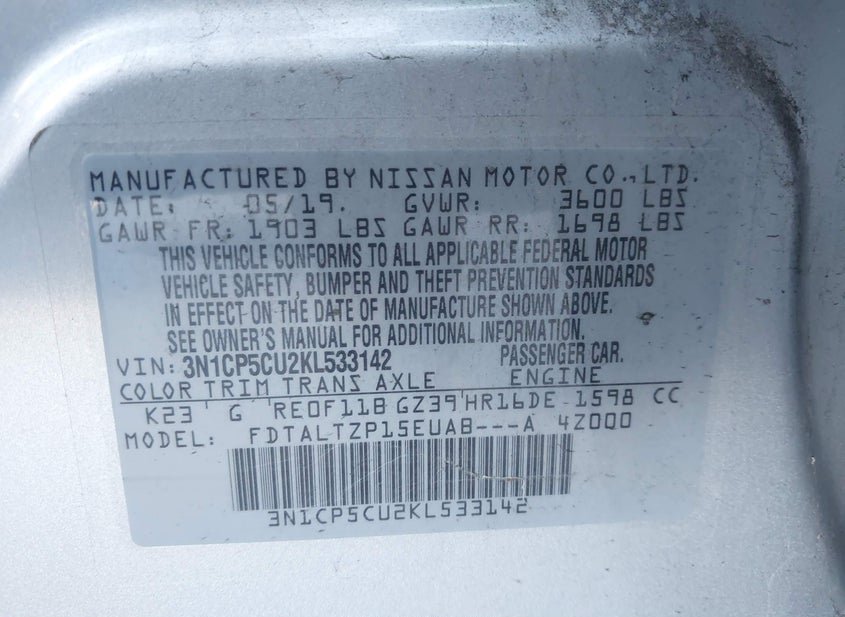 - VIN: 3N1CP5CU2KL533142